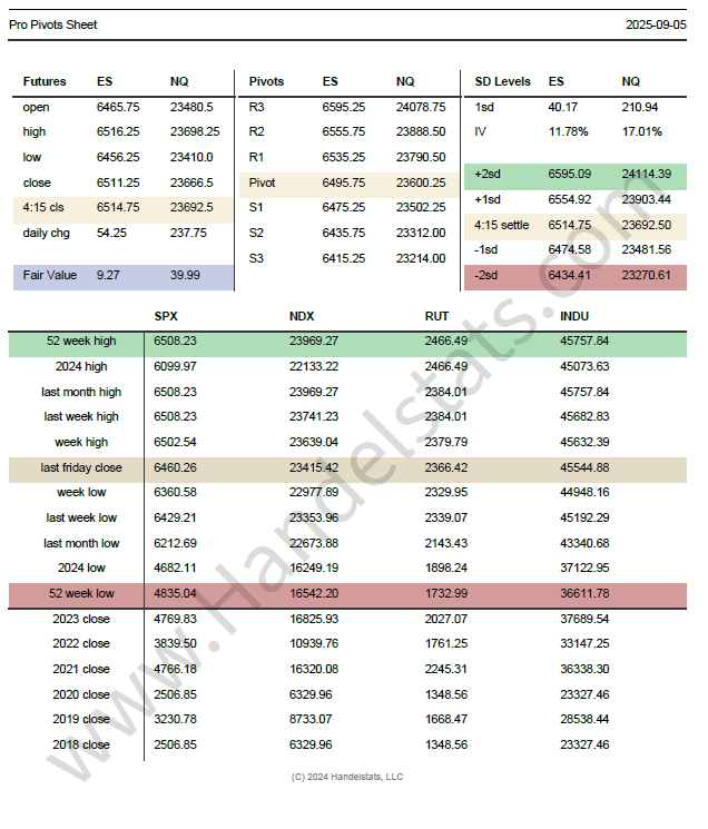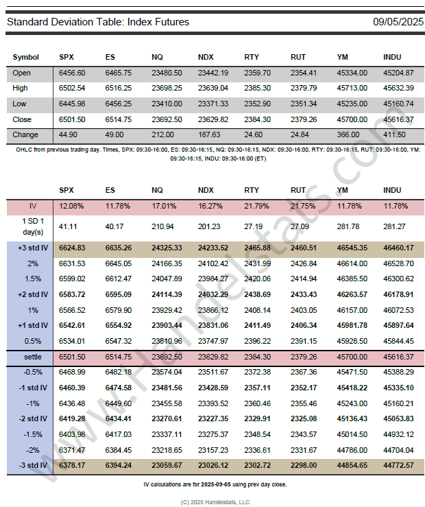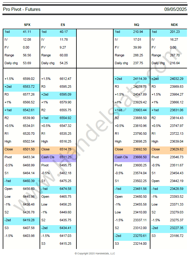 Daily SD levels, pivots, ETF tables, and intraday studies for SPX, NQ, RTY, YM.